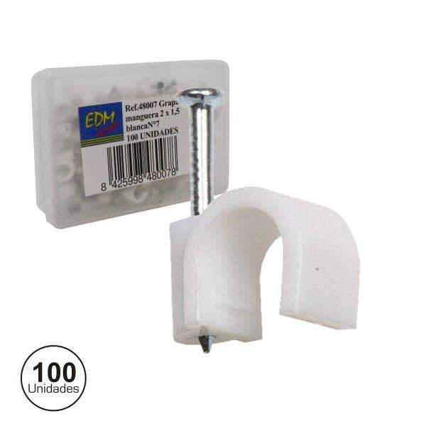 – Braçadeira de parede c/ prego– Área de fixação redonda– Prego em Aço temperado– Braçadeira em ABS Branco– Diâmetro do cabo: Ø7mm– Embalagem c/ 100 unidades
