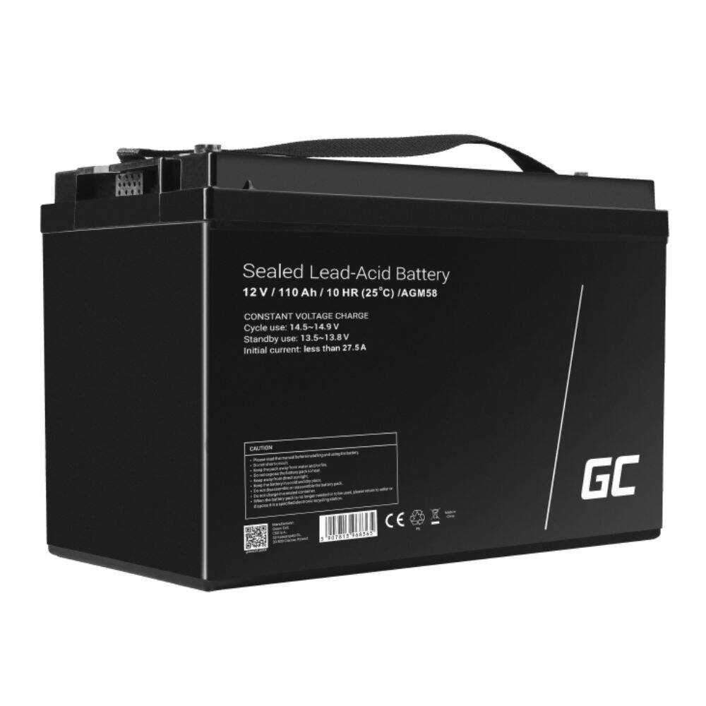 – Bateria de chumbo gel AGM 12V– Carga cíclica: 14.5-14.9V @ 25ºC– Carga flutuante: 13.5-13.8V @ 25ºC– Capacidade: 110Ah– Terminais ligação: T1– Dimensões: 330x171x220mm