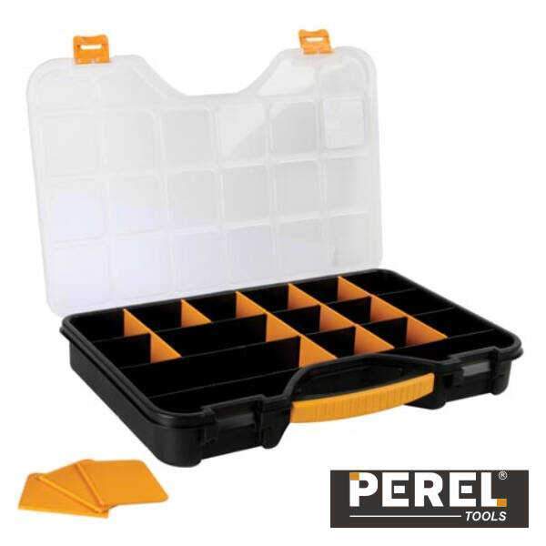 – Caixa Organizadora 24″ c/ 20 Compartimentos– 16 separadores removíveis– Tampa de abertura transparente– Dimensões: 510x341x70mm