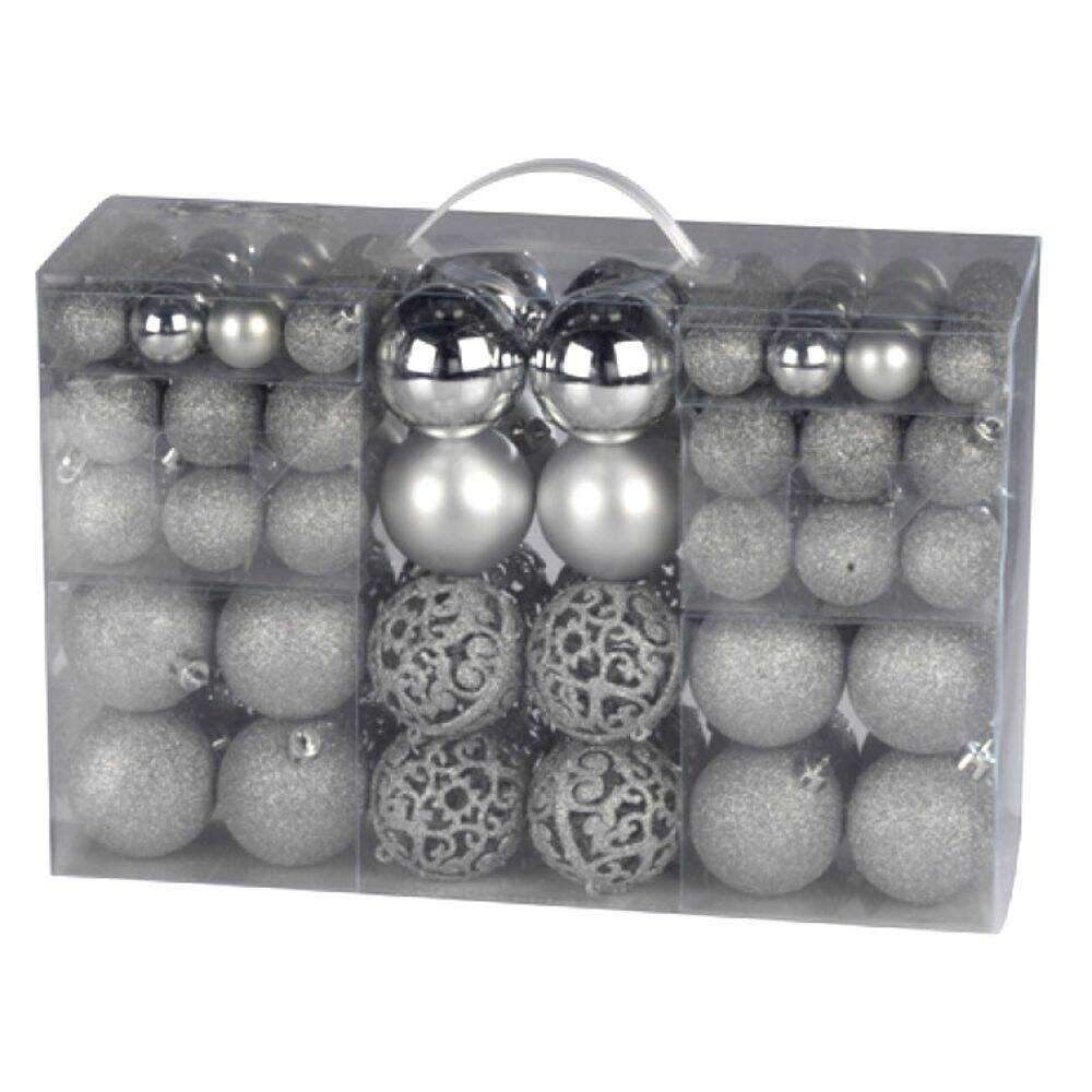 – Conjunto de 100 bolas de natal prateadas– 32 bolas de natal Ø3cm– 36 bolas de natal Ø4cm– 32 bolas de natal Ø6cm