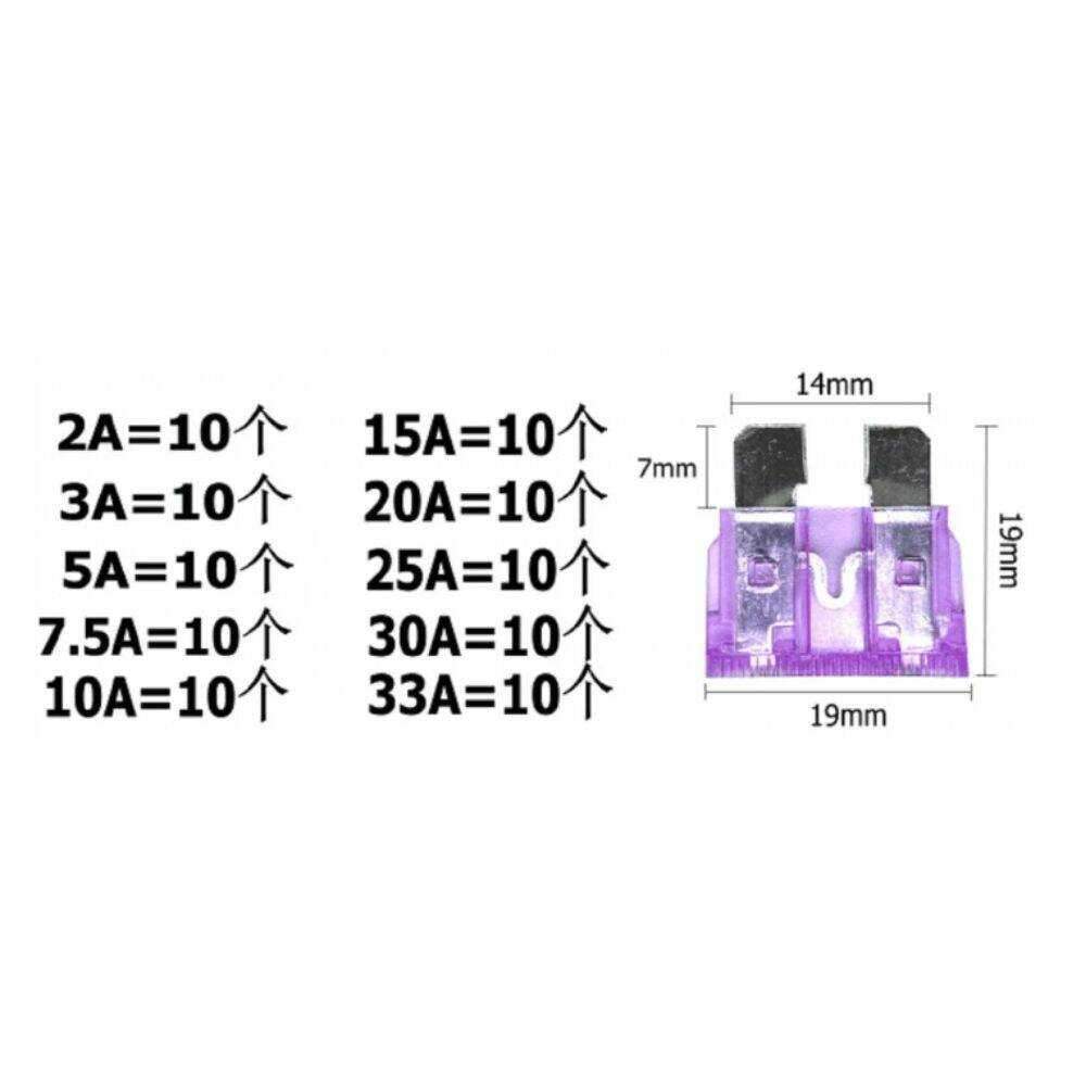 – Conjunto de 100 fusíveis p/ automóvel– Inclui: 10x2A / 10x3A / 10x5A / 10×7.5A / 10x10A10x15A / 10x20A / 10x25A / 10x30A / 10x33A
