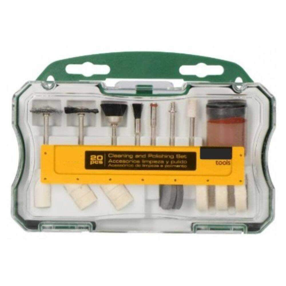 – Mala c/ 20 acessórios p/ berbequim– Adequado p/ trebalhos diversos– Forneciso em caica de plástico– Dimensões: 173 x 125 x 41 mm