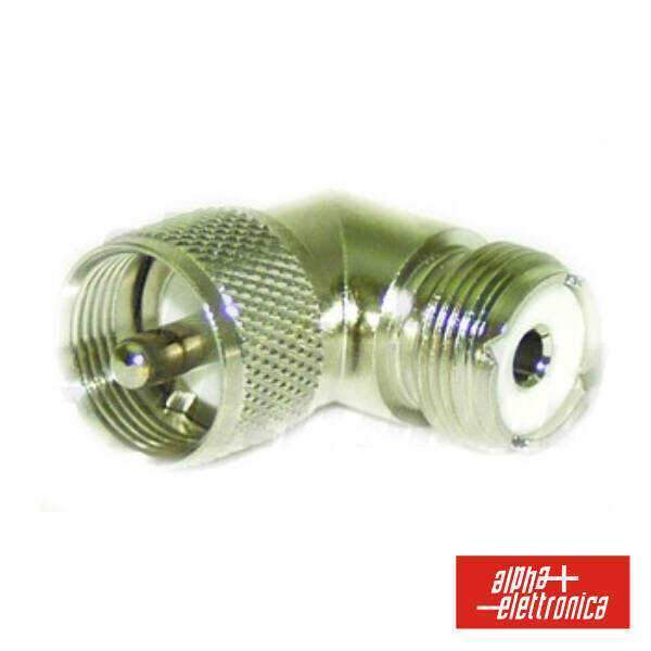 – Ficha adaptadora de UHF / M359– UHF Macho / M359 Fêmea c/ 90º– Estrutura Niquelada– Isolamento em Delrin