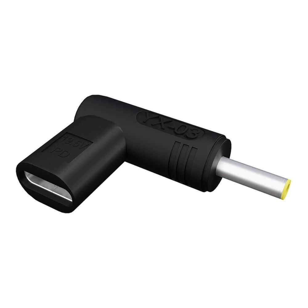 – Ficha adaptadora USB-C / DC angular– USB-C Fêmea / DC 4.0×1.7mm– Estrutura em plástico de cor preta– Tensão máxima: 19,5V