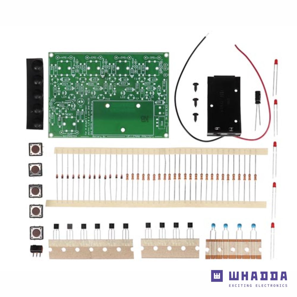 – 4 Botões para os jogadores do quiz– 1 Botão de reset– 4 LEDs vermelhos para indicar o jogador mais rápido– Pads de conexão p/ conectar botões externos ao kit– Botão liga/desliga