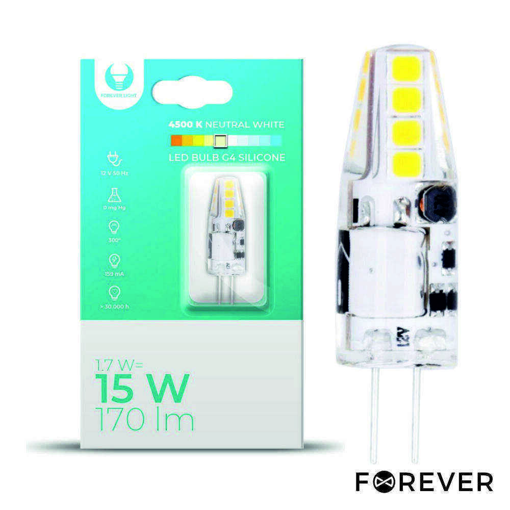 – Lâmpada G4 LED 12V– Tipo de Casquilho: G4– Tensão funcionamento: 12V– Potência: 1.7W=15W, Branco Quente– Temperatura cor: 4500K, 170 Lumens– Ângulo: 300º, tempo vida: 30000h