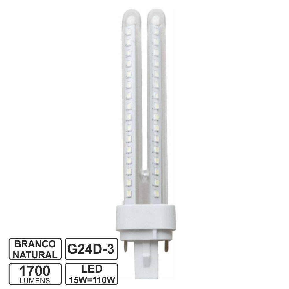 – Lâmpada G24 B5 PLC 2U LED– Tipo de Casquilho: G24 (G24d-3)– Tensão funcionamento: 230Vac– Potência: 15W, equivalente a 110W– Temperatura cor: 4000k, 1700 Lumens– Ângulo: 360º