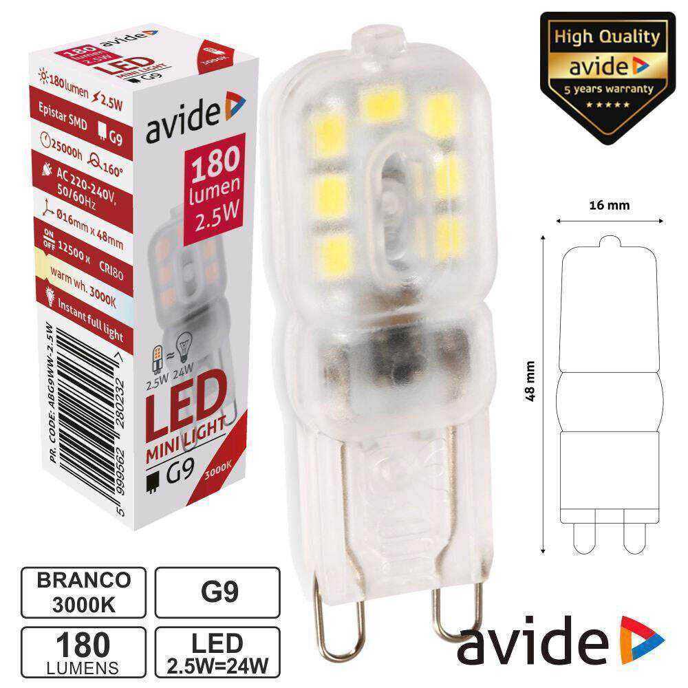 – Lâmpada G9 LED– Tipo de Casquilho: G9– Tensão funcionamento: 230VAC– Potência: 2.5W=24W, Branco Quente– Temperatura cor: 3000k, 180 Lumens– Ângulo: 160º, tempo vida: 25000h