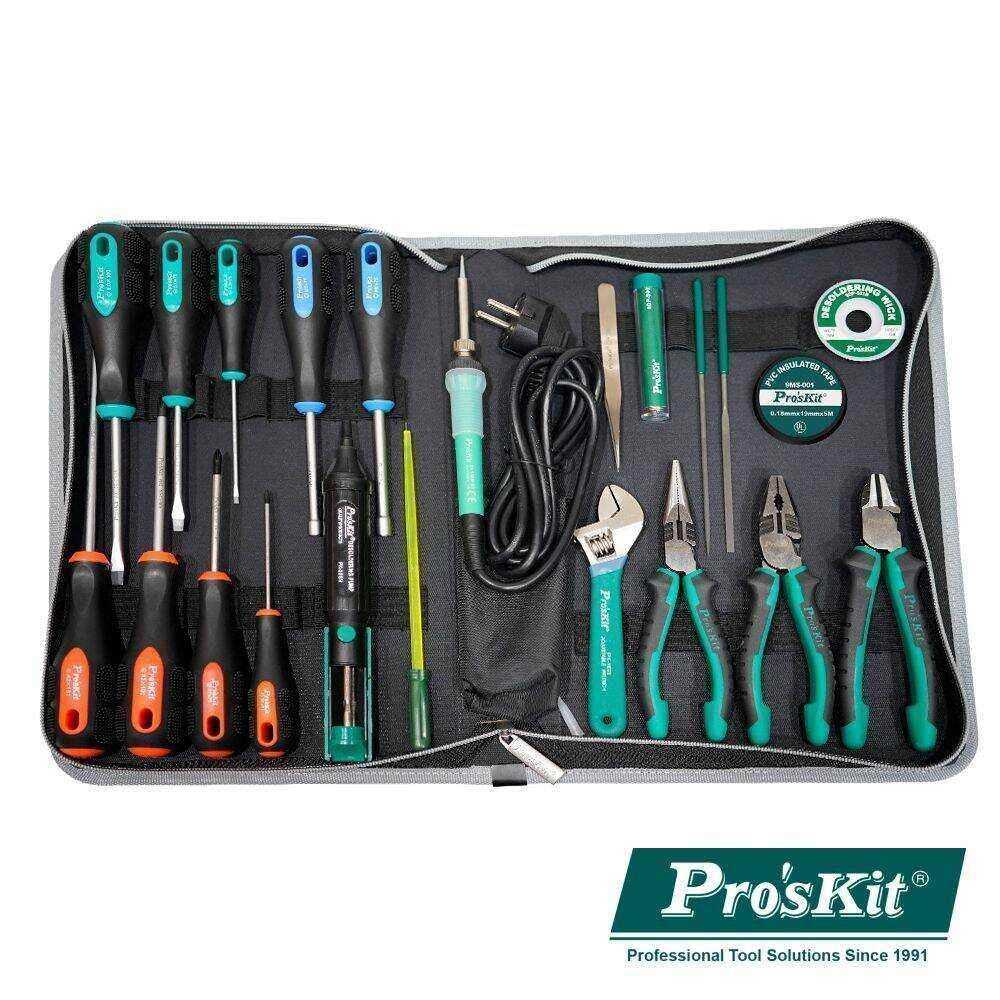 – Ferro de soldar c/ resistência em cerâmica– Acessórios de soldadura– Conjunto de 3 alicates– Chaves Philips e Fendas– Pinça e 2 Limas– Chave inglesa