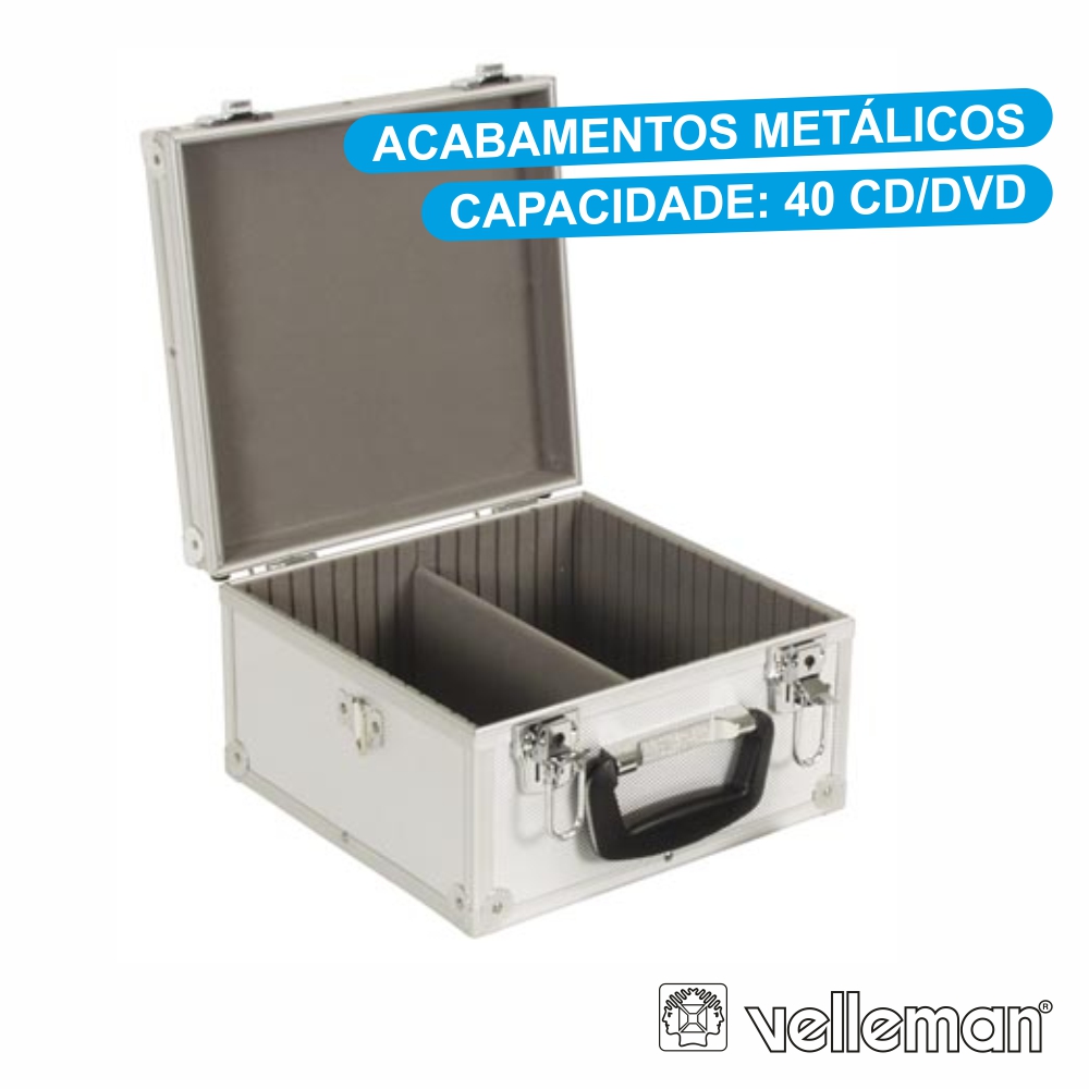 – Mala metálica c/ compartimentos ajustáveis– Compartimentos almofadados, tampa amovível– Cantos reforçados p/ maior segurança– Capacidade armazenamento: 80 CD/DVD– 2 Fechaduras, alça p/ meter ao ombro