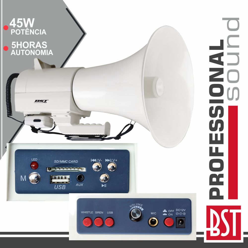 Megafone 45W Mic Removível Mp3 12V USB/SD 2 Alertas BST