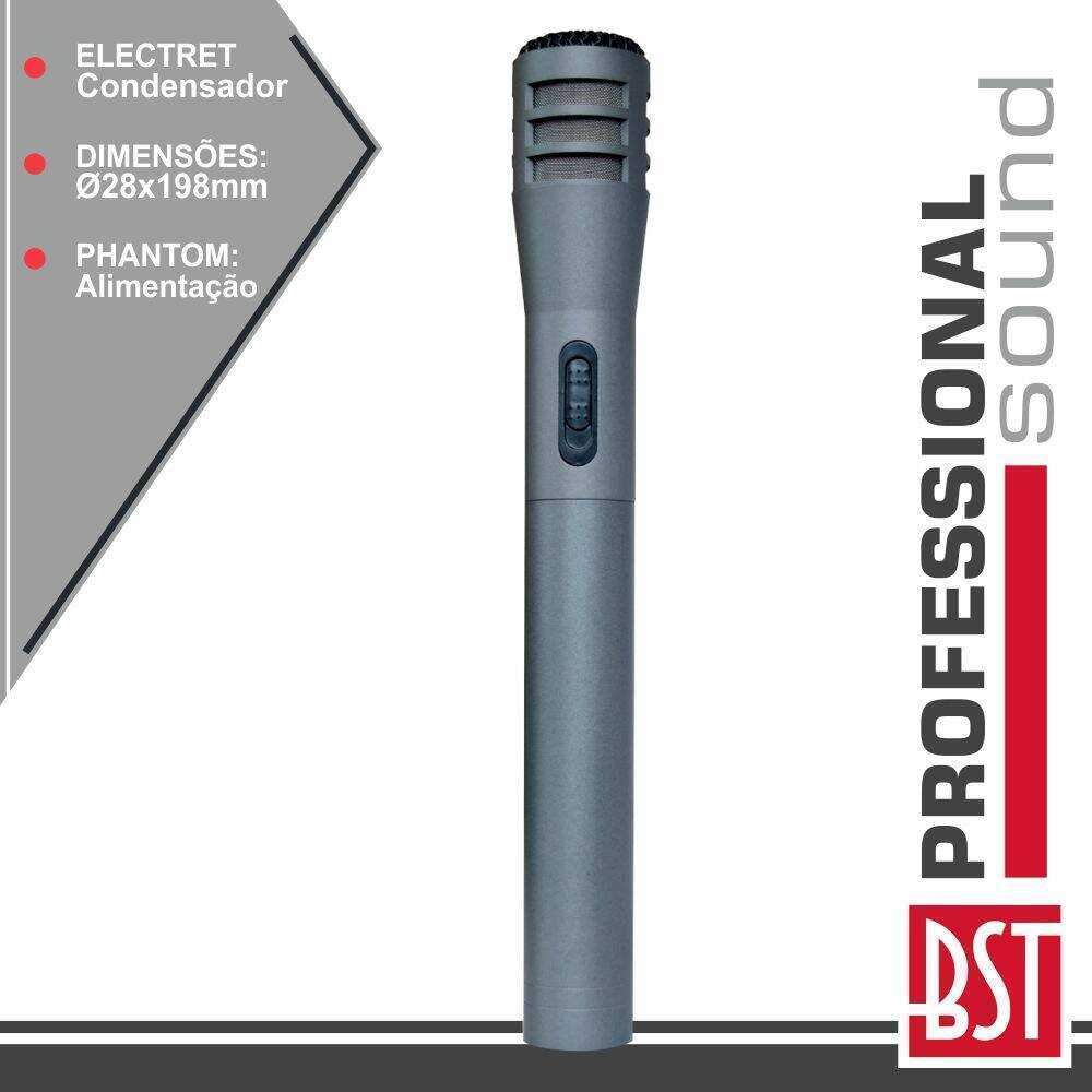 – Microfone Condensador electreto cardióide– Estrutura metálica, sensibilidade: 70dB– Impedância: 3000 Ohms– Alimentação: bateria 1.5V ou Phantom