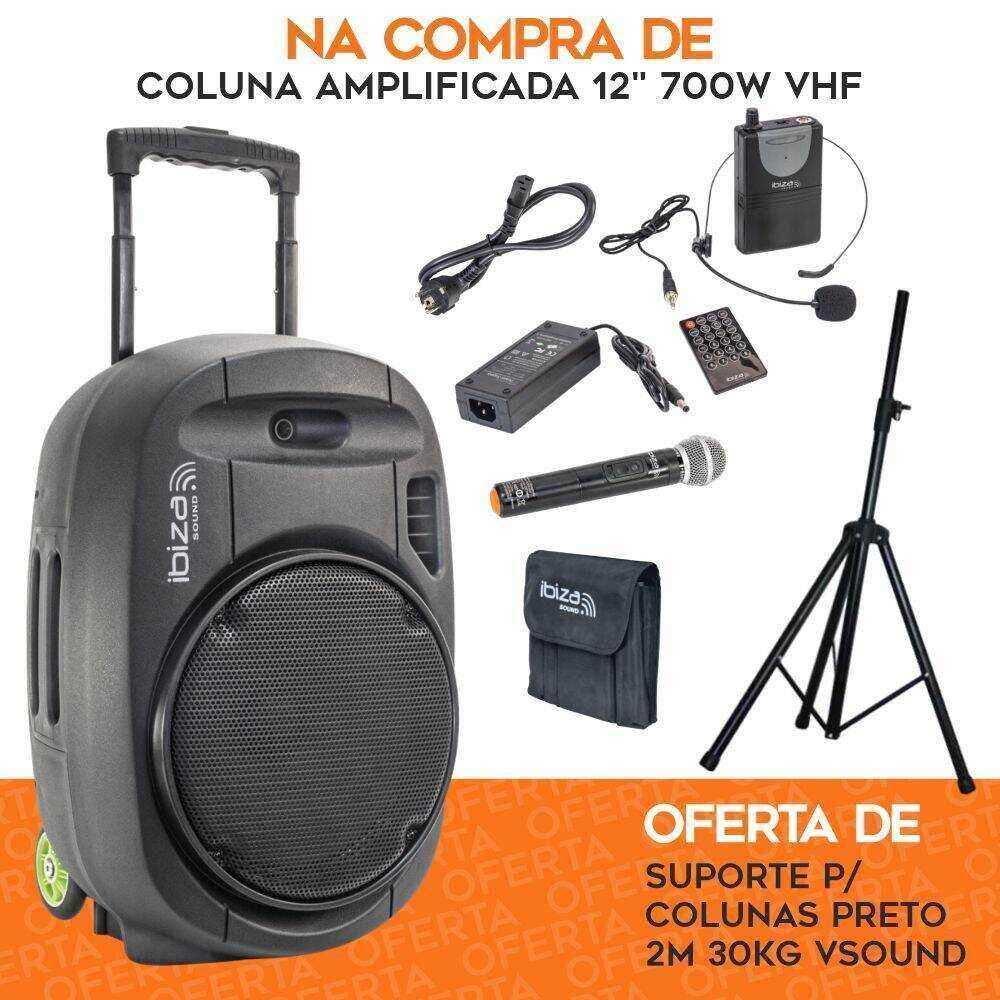 – Pack Coluna Amplificada 12″ 700W USB/BT/SD/BAT VHF Preta– Oferta de Suporte P/ Colunas Preto 1.8m 30kg