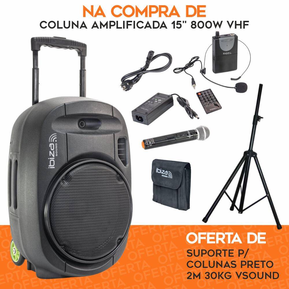 – Pack Coluna Amplificada 15″ 800W USB/BT/SD/Bat VHF Preta– Oferta de Suporte P/ Colunas Preto 1.8m 30kg