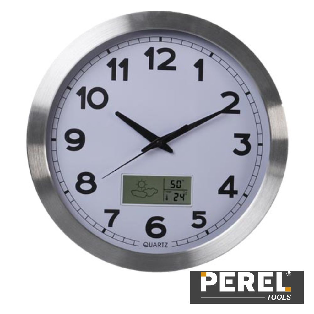 – Relógio de parede multifunções– Termómetro: de -10 °C a 60 °C ± 1 °C– Alimentação relógio: 1.5 AA (não inc.)– Alimentação LCD: 1.5x AAA (não inc.)– Estrutura em Alumínio