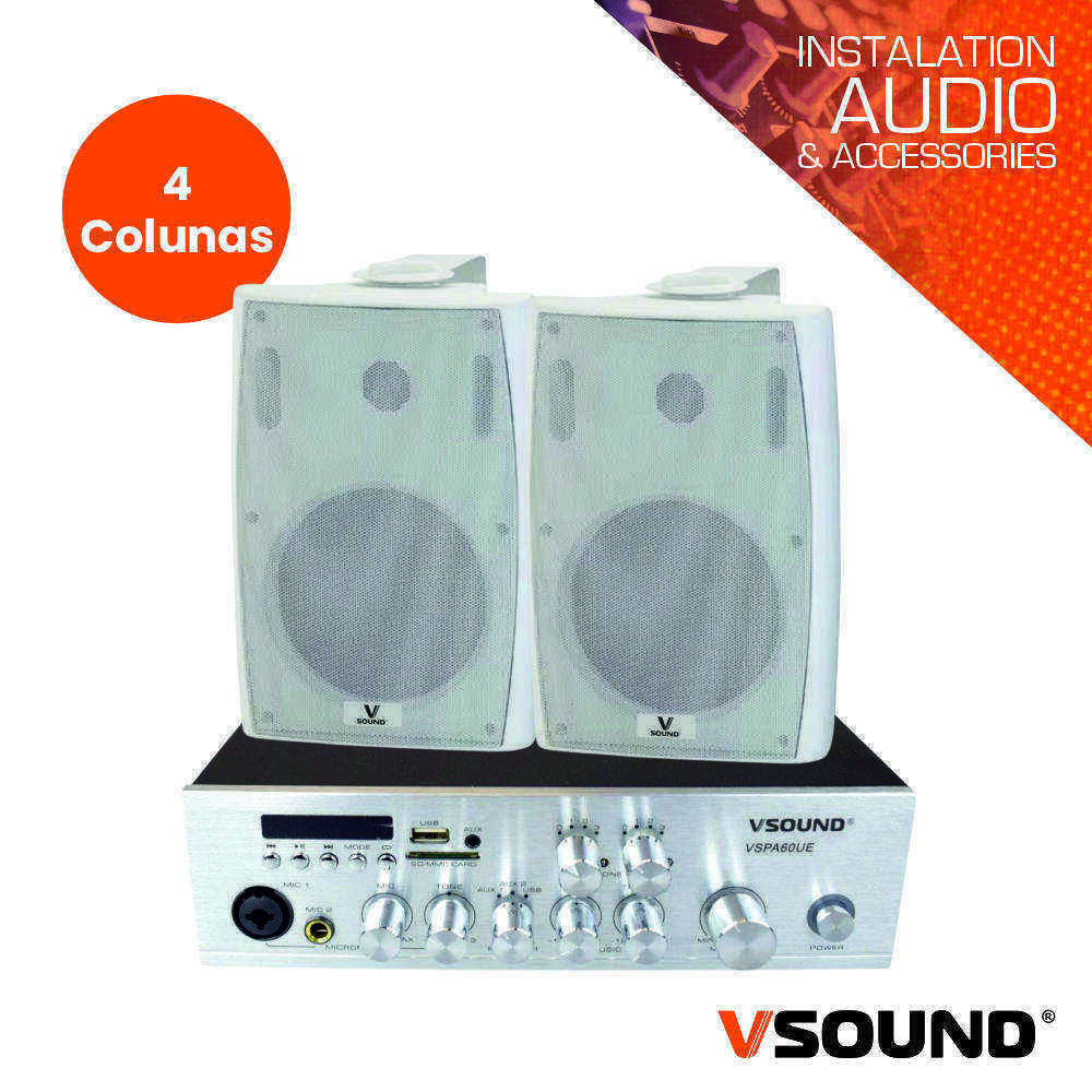– Amplificador 12/220V 120W MP3/USB/SD VSOUND– 2x Conjuntos 2 Colunas 2 Vias 8 Ohm 100v 40w 4″ Brancas
