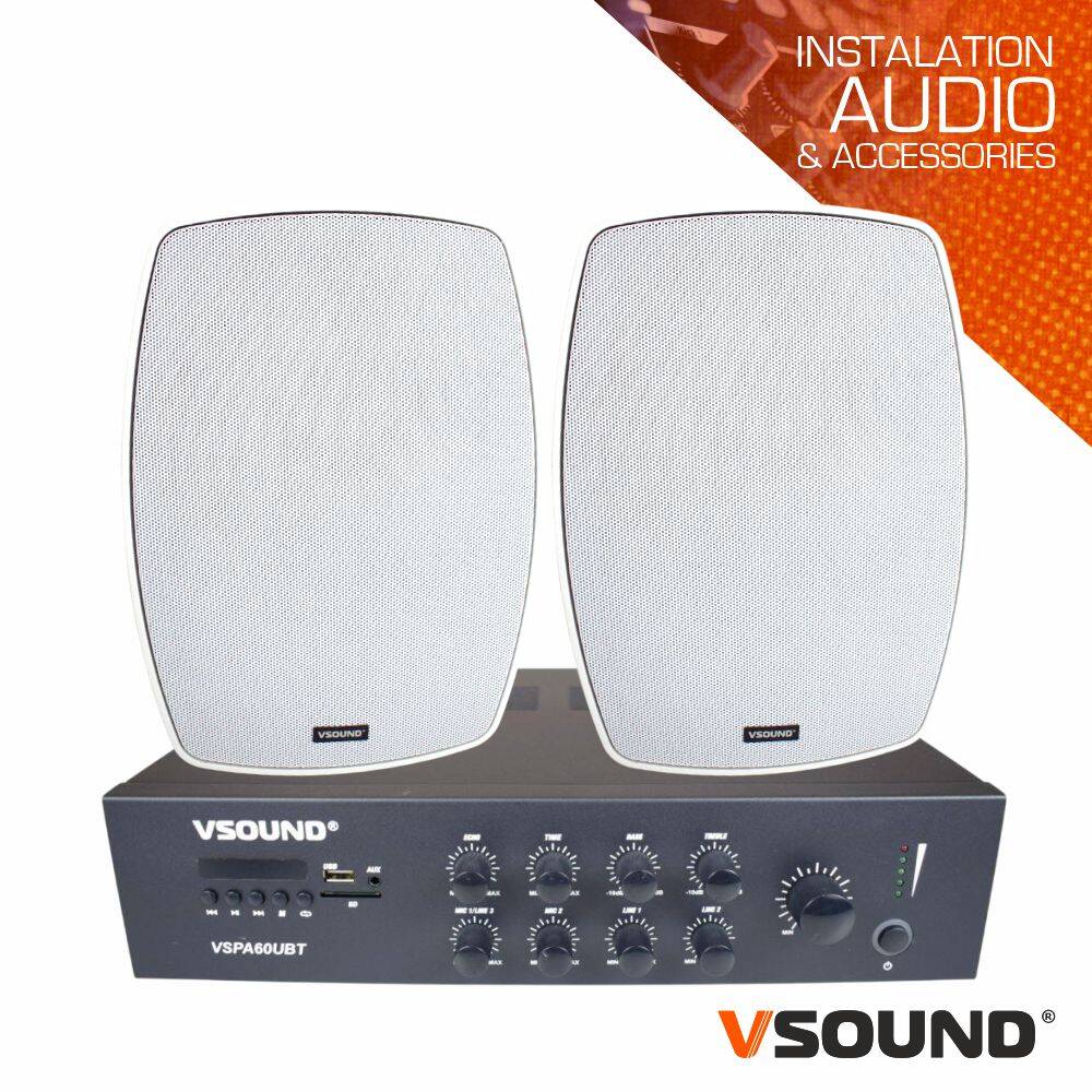 – Amplificador PA 12/220V 3 Entr.120W BT/MP3/USB/SD/FM– Conjunto 2 Colunas Passivas 6″ 120W 100V IPX5 VSOUND